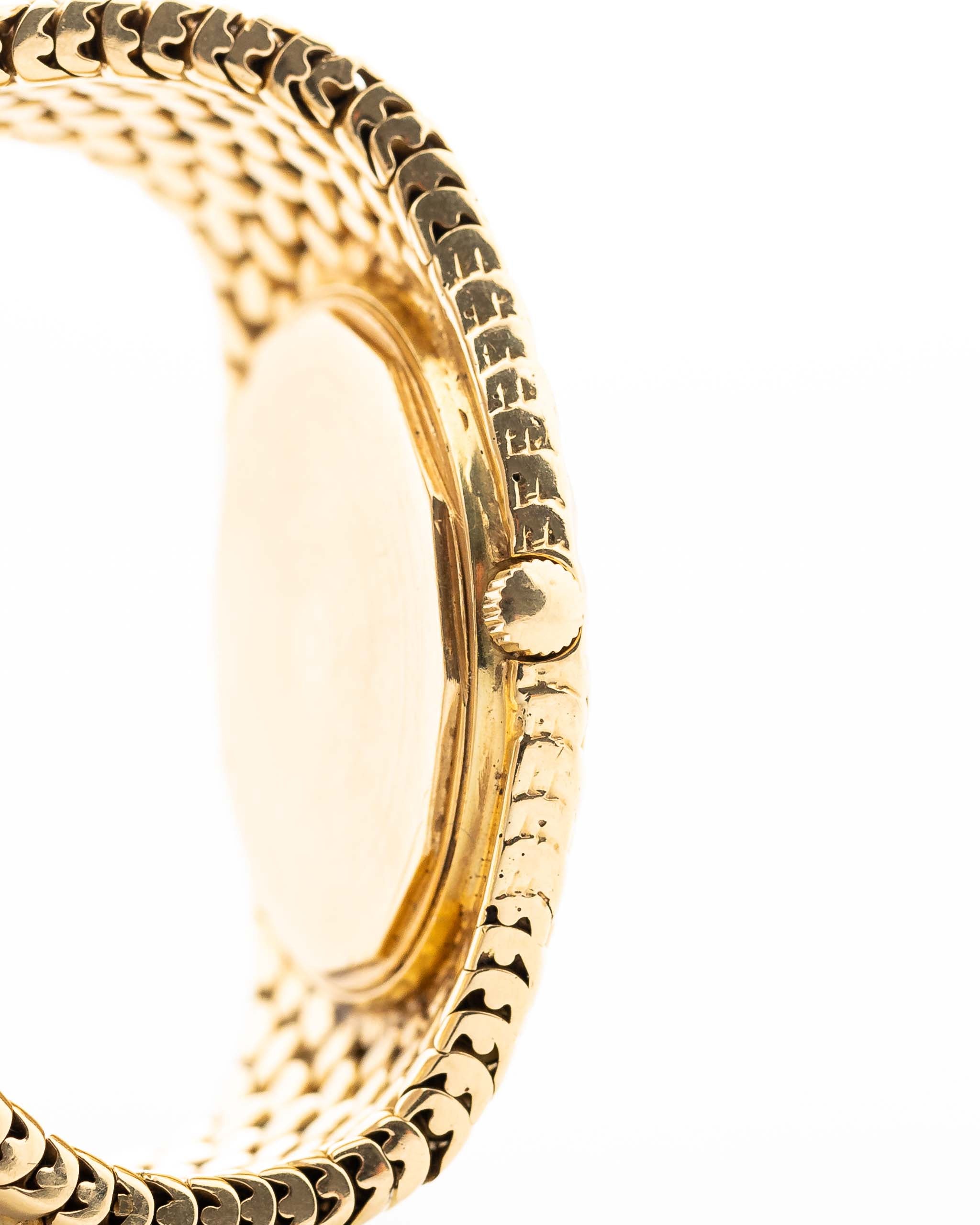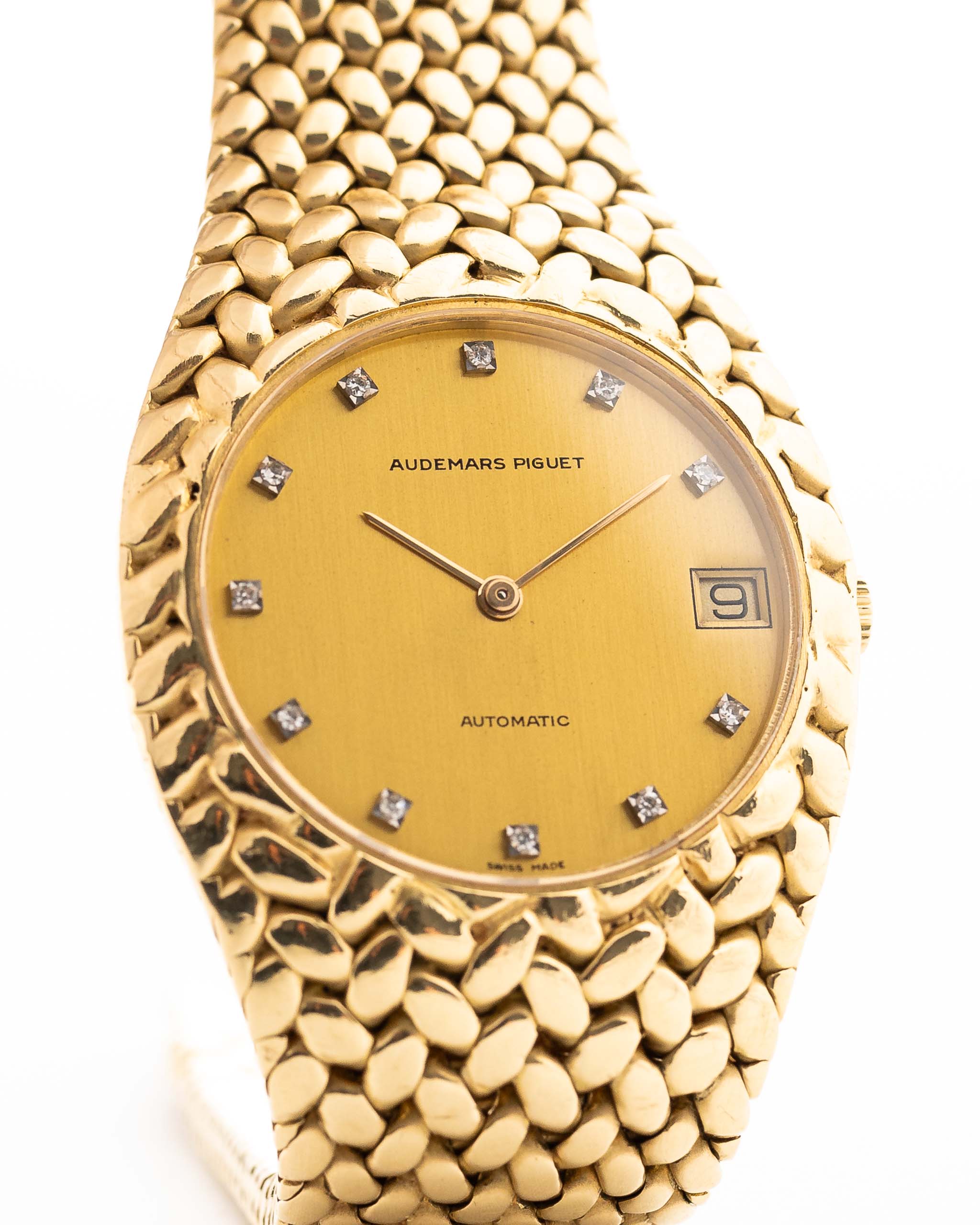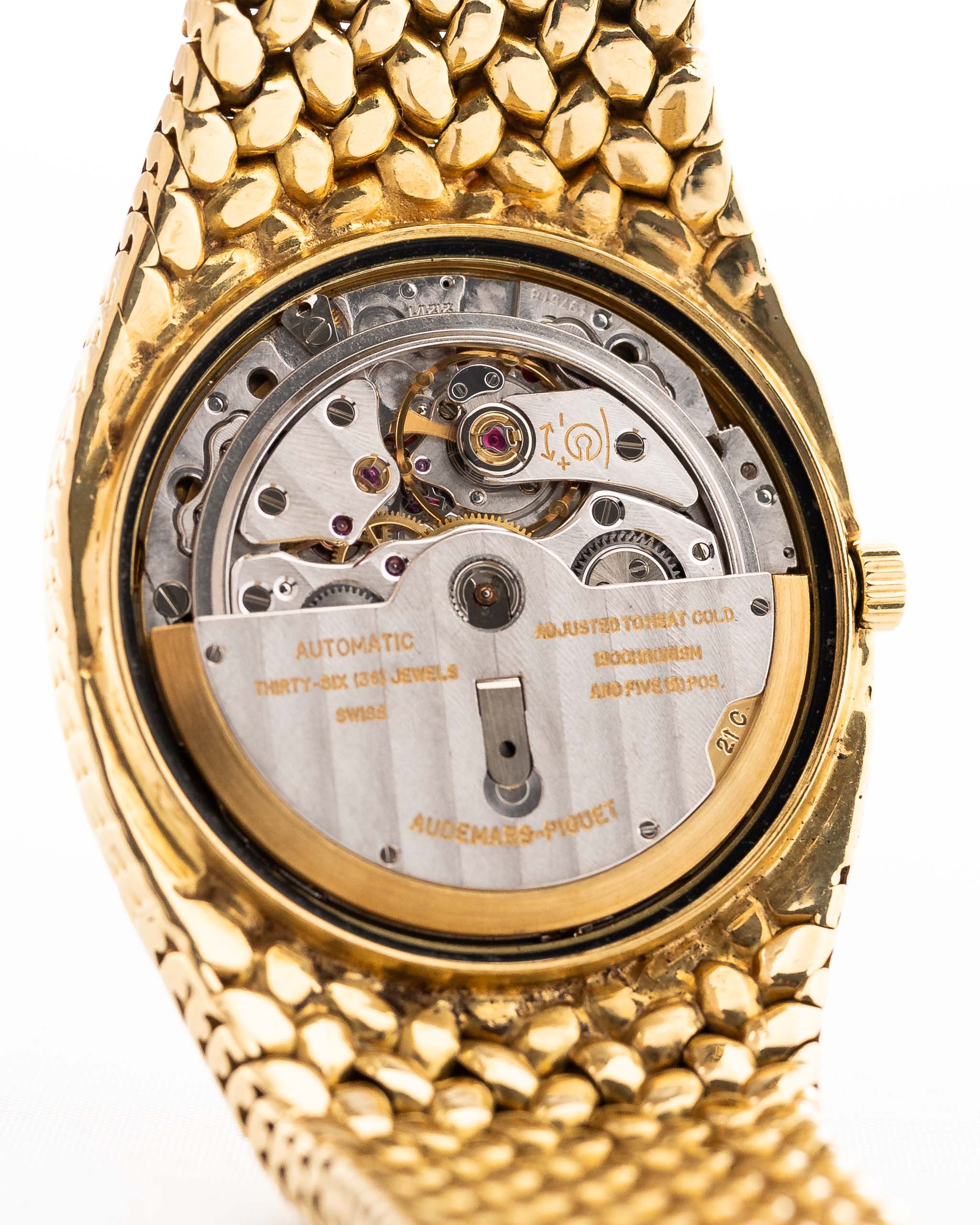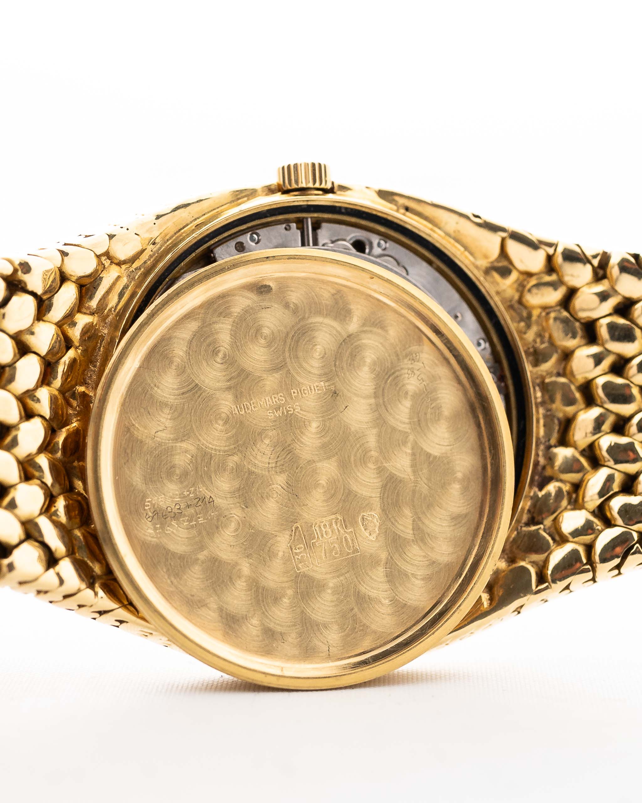 The heavy 18k yellow gold case measuring 35 mm in diameter, is in sharp condition and seamlessly integrated into a braided bracelet, earning the “Cobra” nickname due to its resemblance to a snake’s scales. The icing on the cake are the 11 diamond hour markers. Inside we have the reliable automatic calibre 2121/1 from Audemars Piguet.