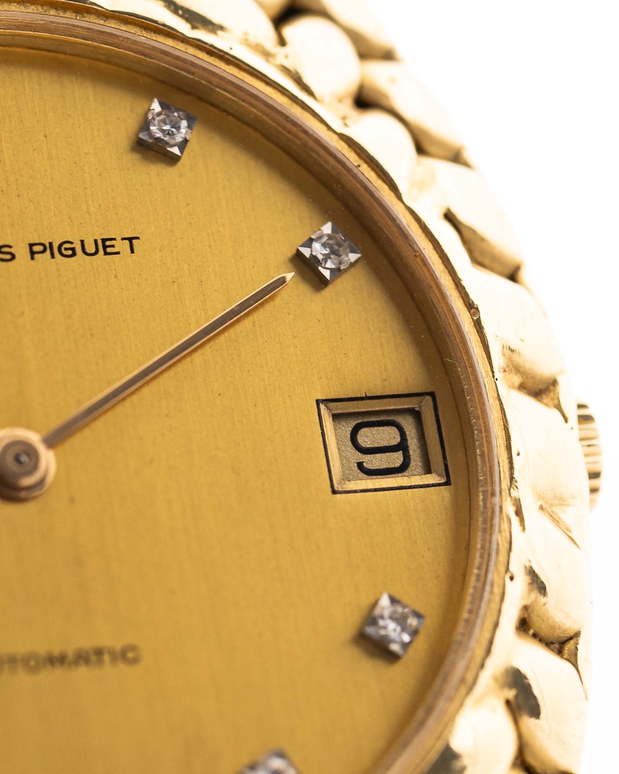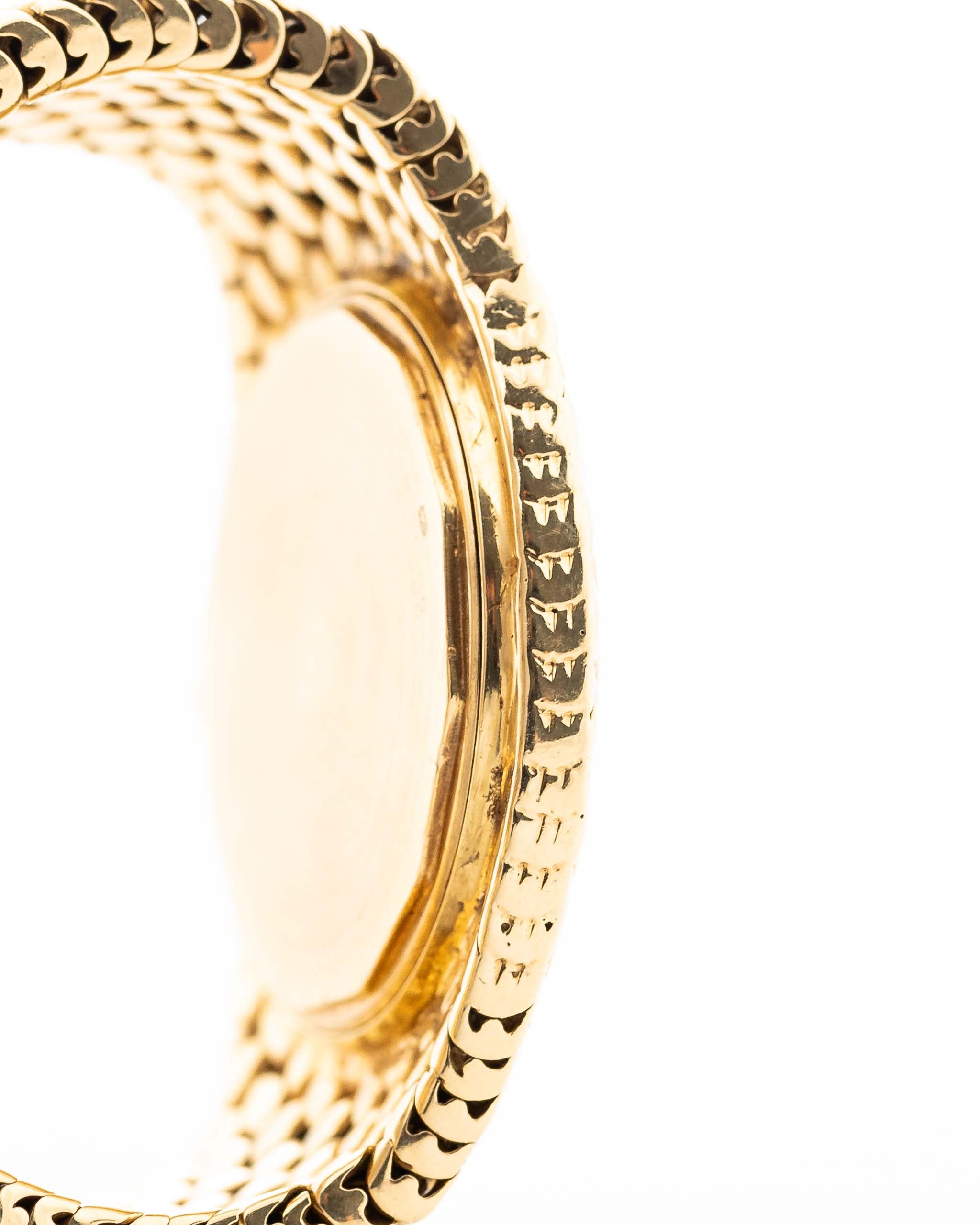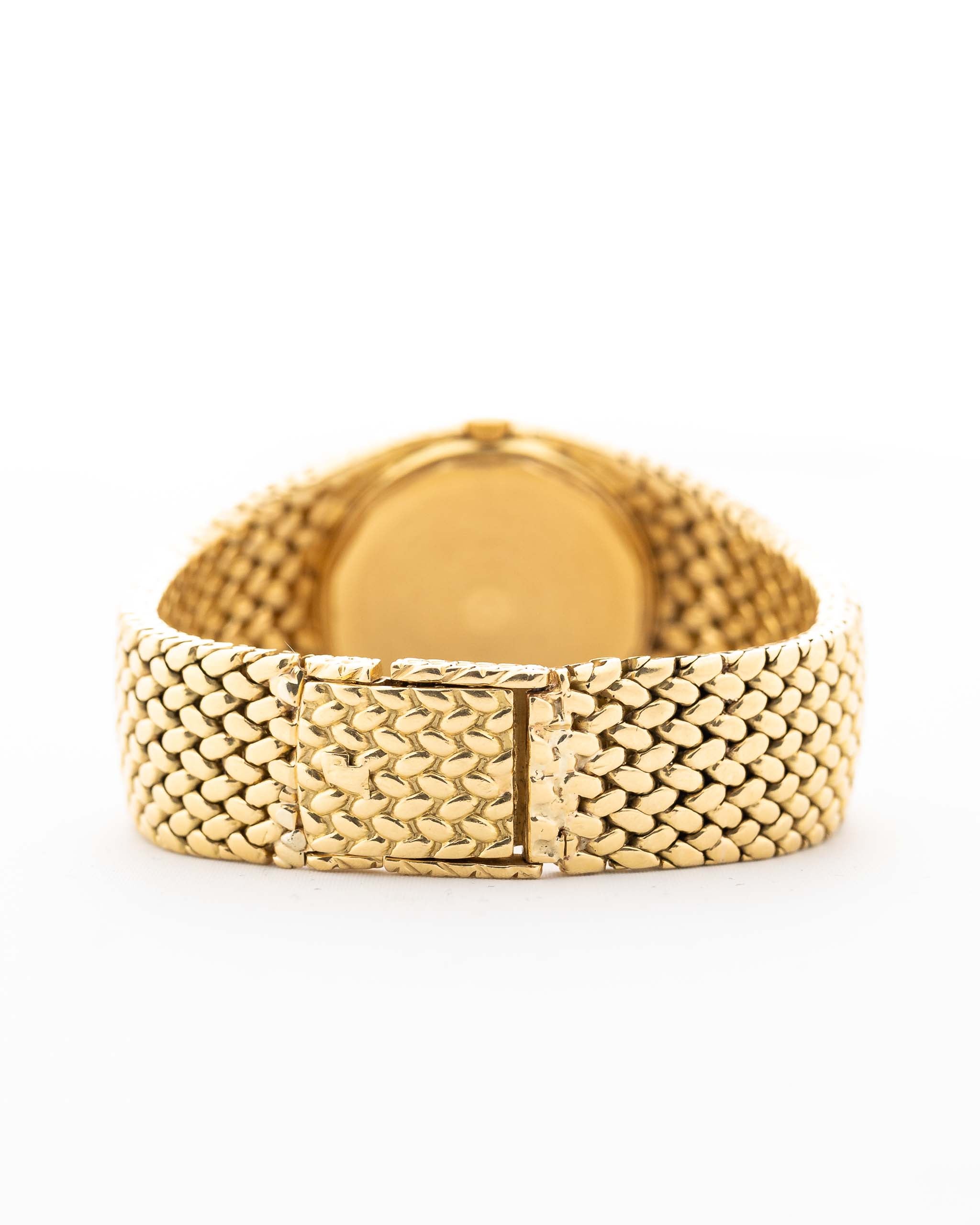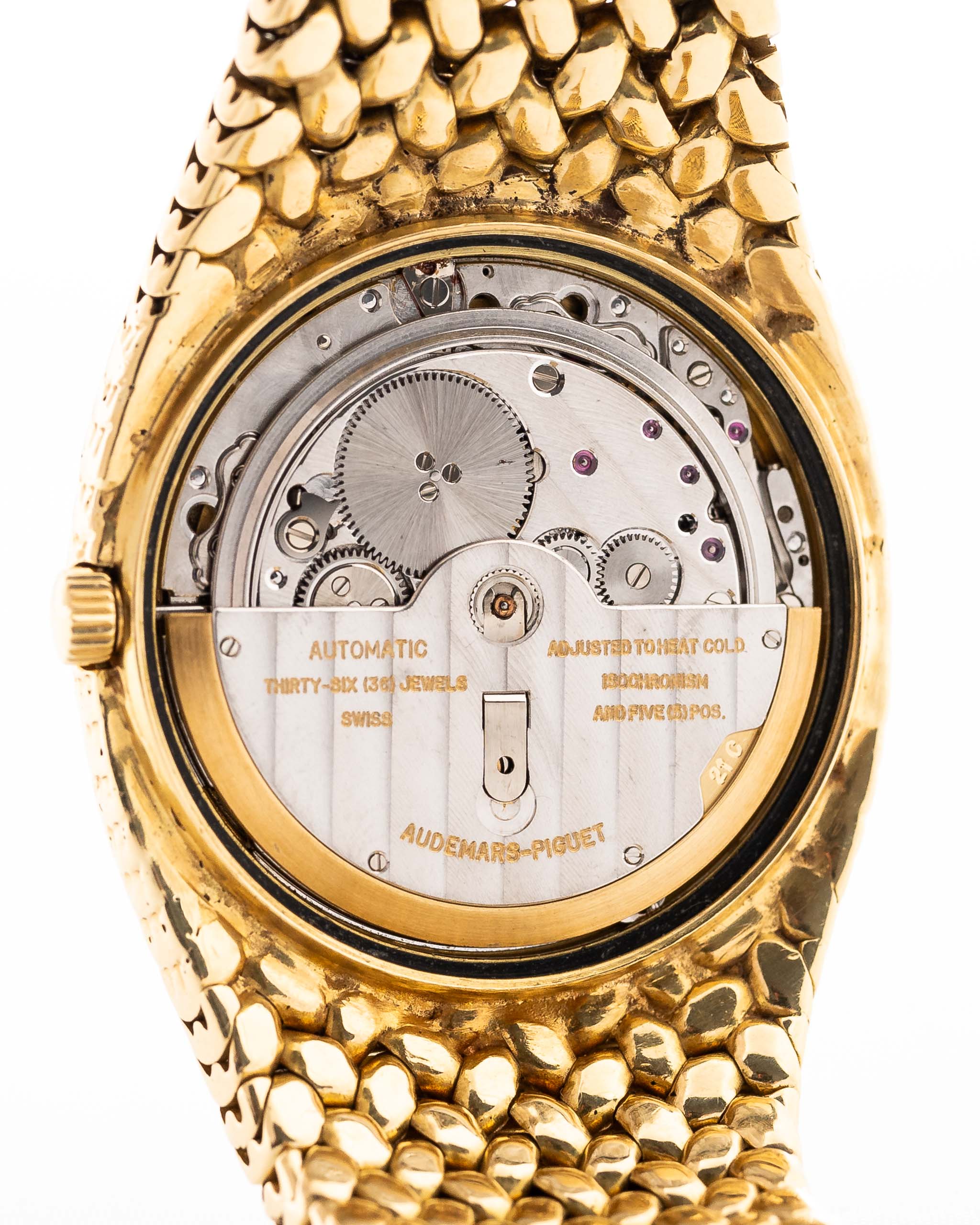 The heavy 18k yellow gold case measuring 35 mm in diameter, is in sharp condition and seamlessly integrated into a braided bracelet, earning the “Cobra” nickname due to its resemblance to a snake’s scales. The icing on the cake are the 11 diamond hour markers. Inside we have the reliable automatic calibre 2121/1 from Audemars Piguet.