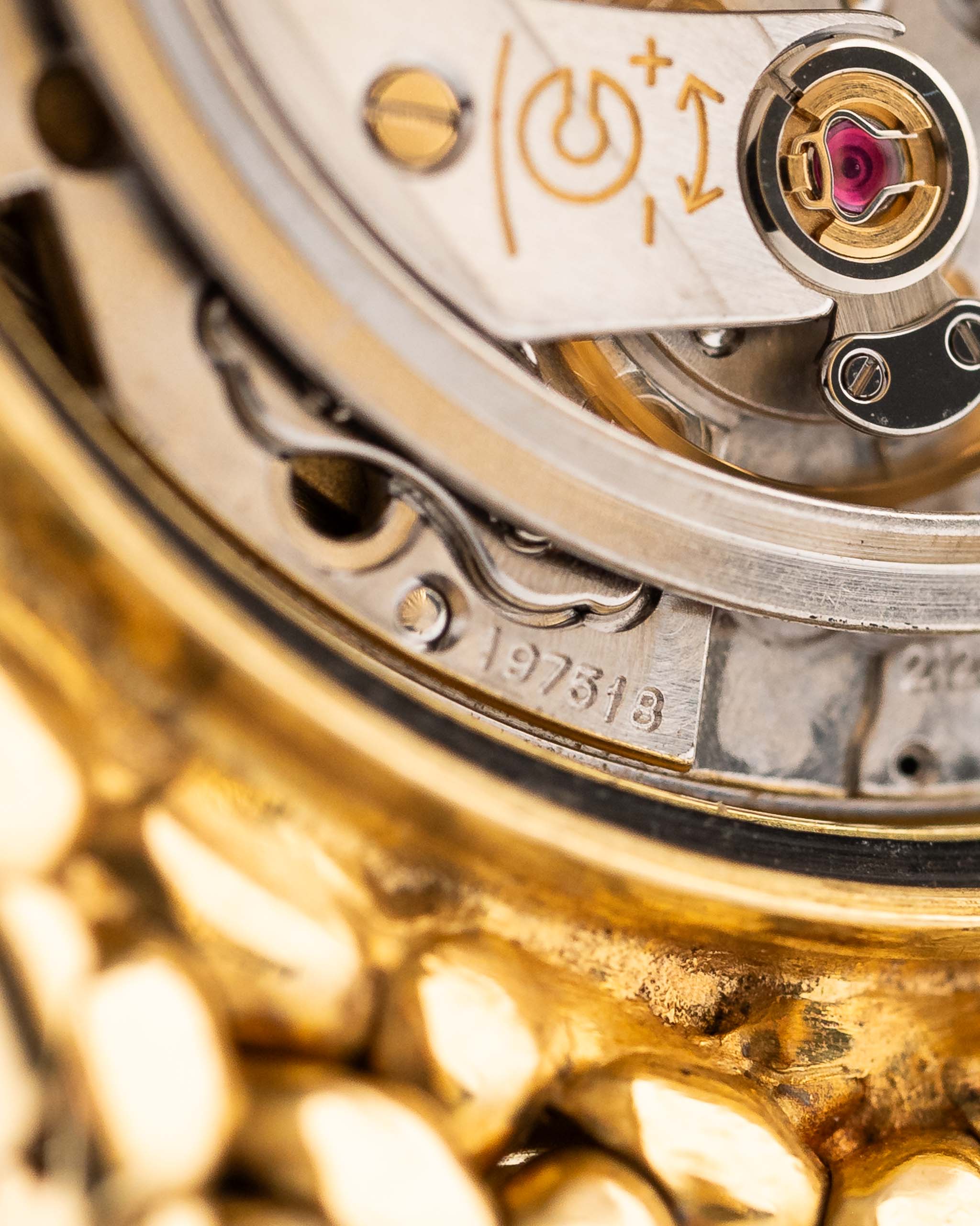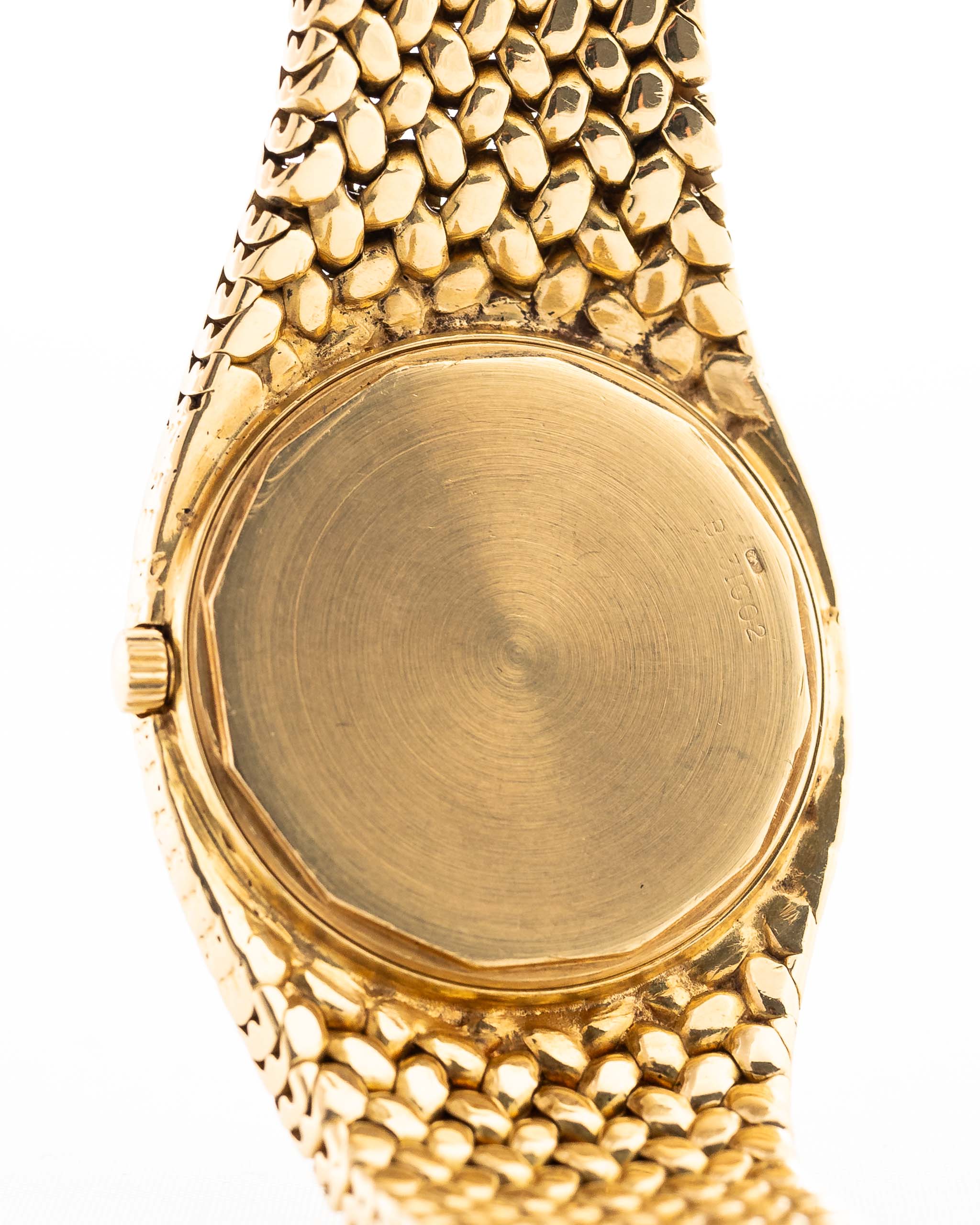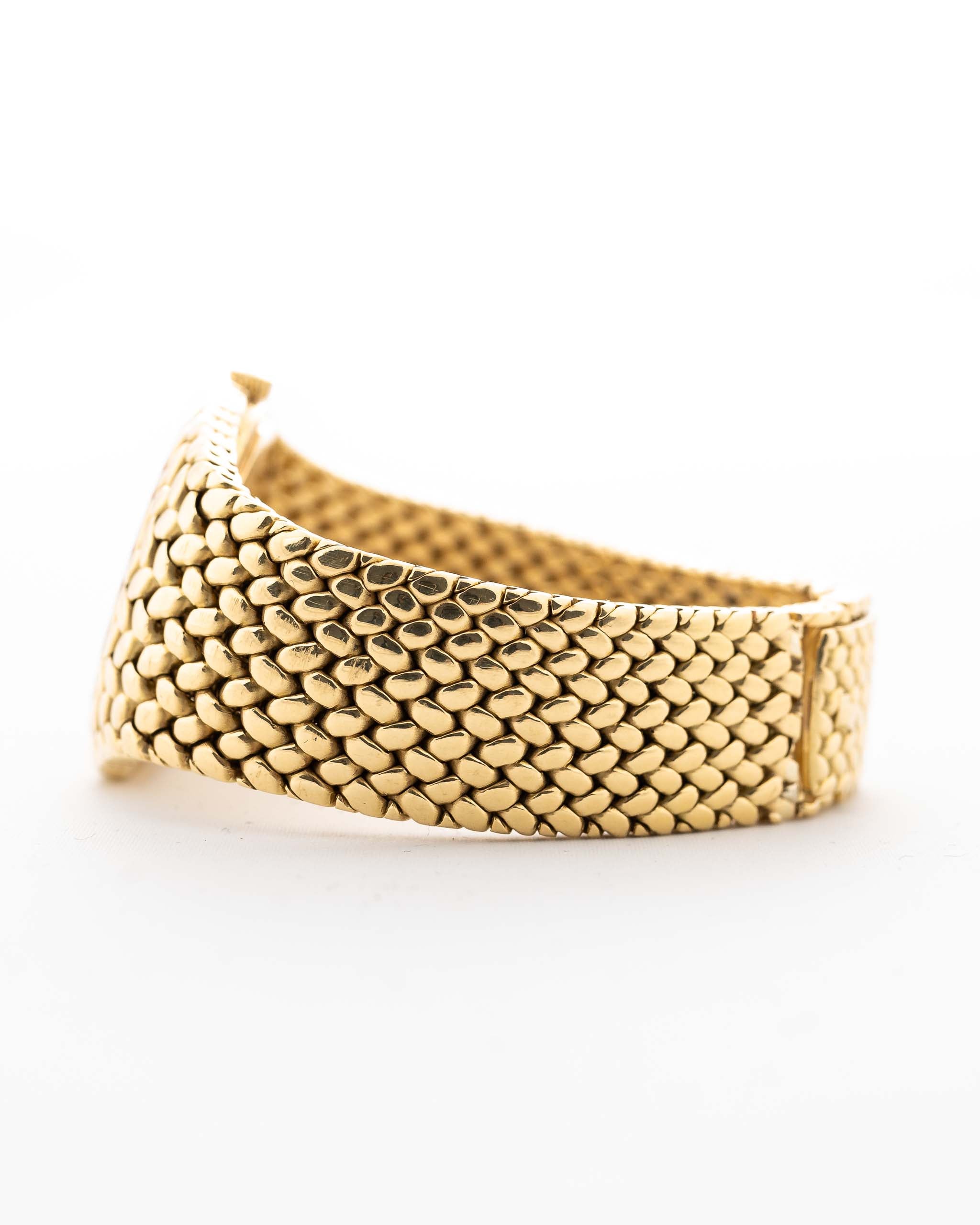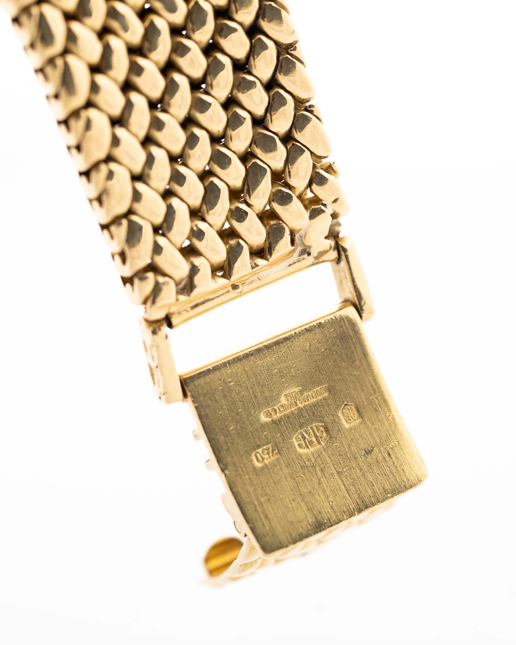 The heavy 18k yellow gold case measuring 35 mm in diameter, is in sharp condition and seamlessly integrated into a braided bracelet, earning the “Cobra” nickname due to its resemblance to a snake’s scales. The icing on the cake are the 11 diamond hour markers. Inside we have the reliable automatic calibre 2121/1 from Audemars Piguet.