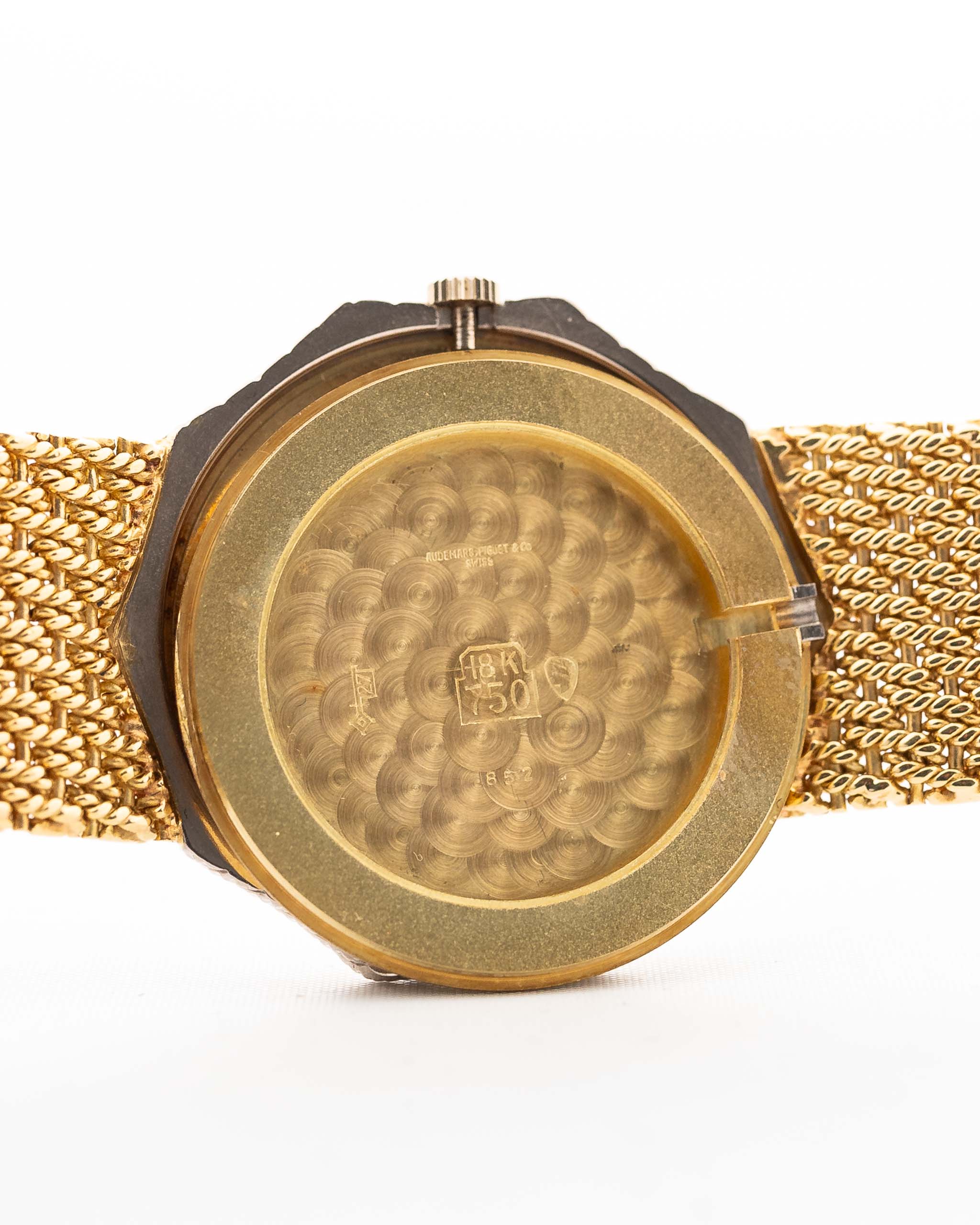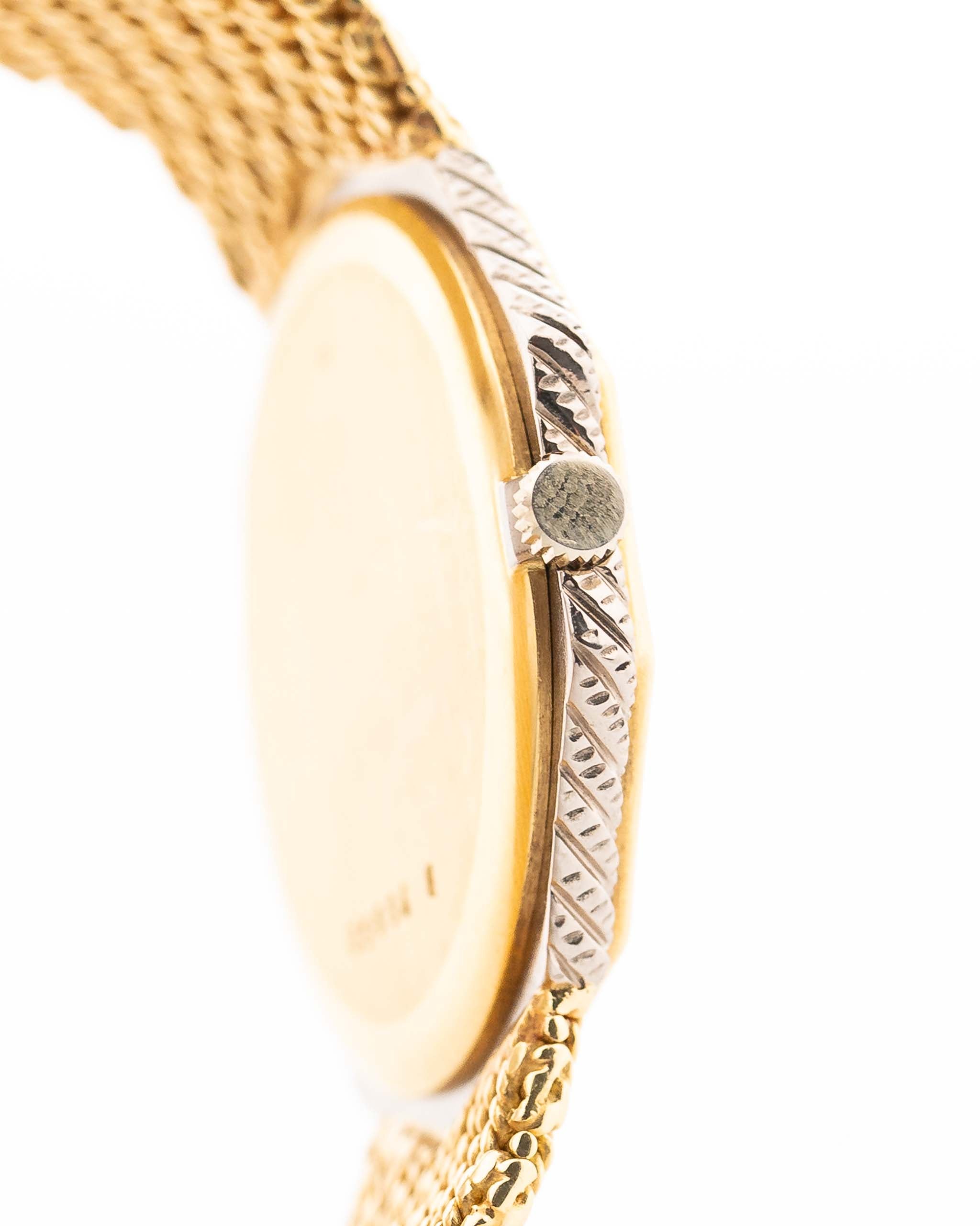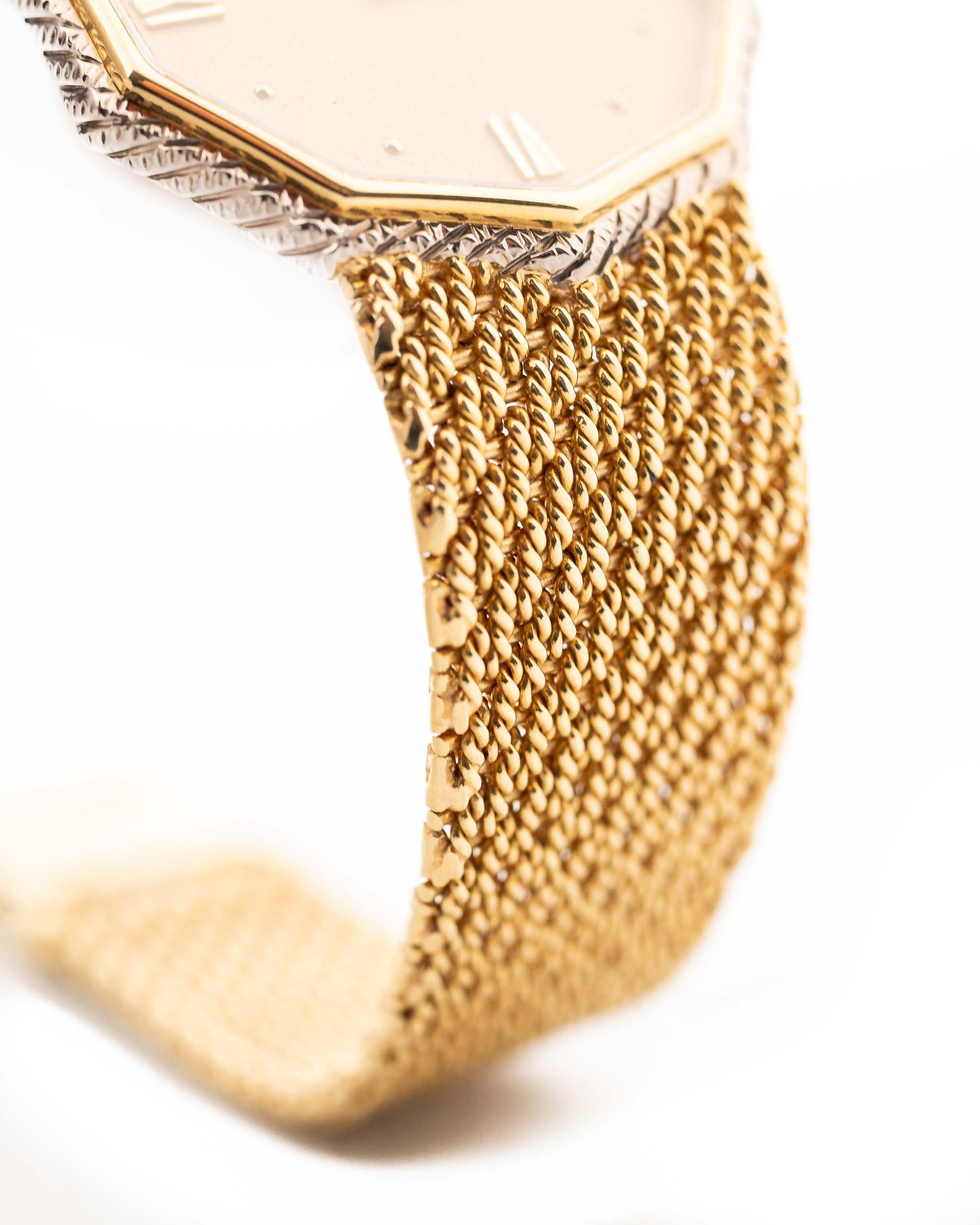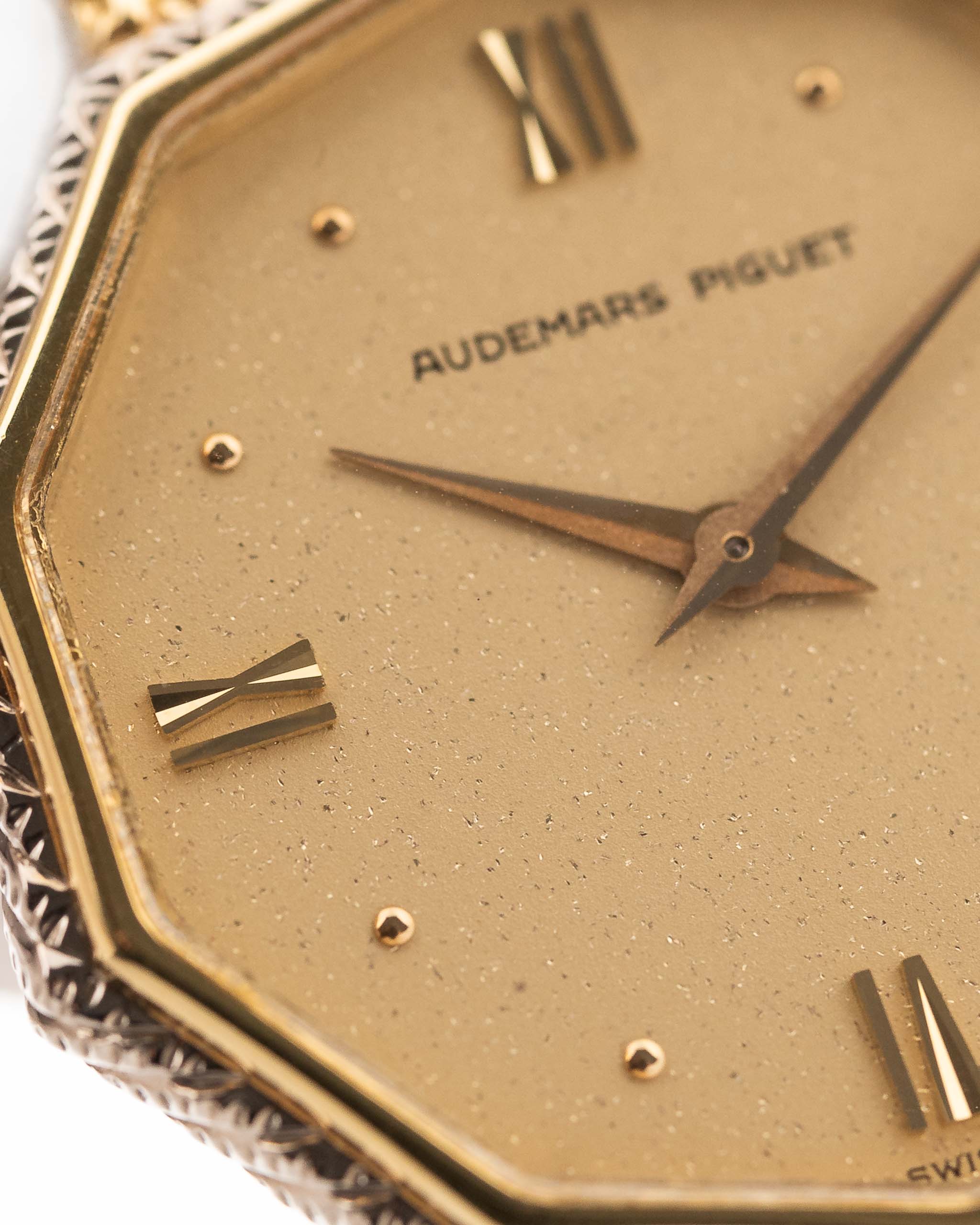 An octagon shaped 18k yellow gold case golden aventurine dial with AP logo. Golden roman twelve, three, six, nine dial layout and alpha handset. The icing on the cake is the white gold bezel in rope design and very unique 18k yellow gold bracelet with AP logo at the clasp.