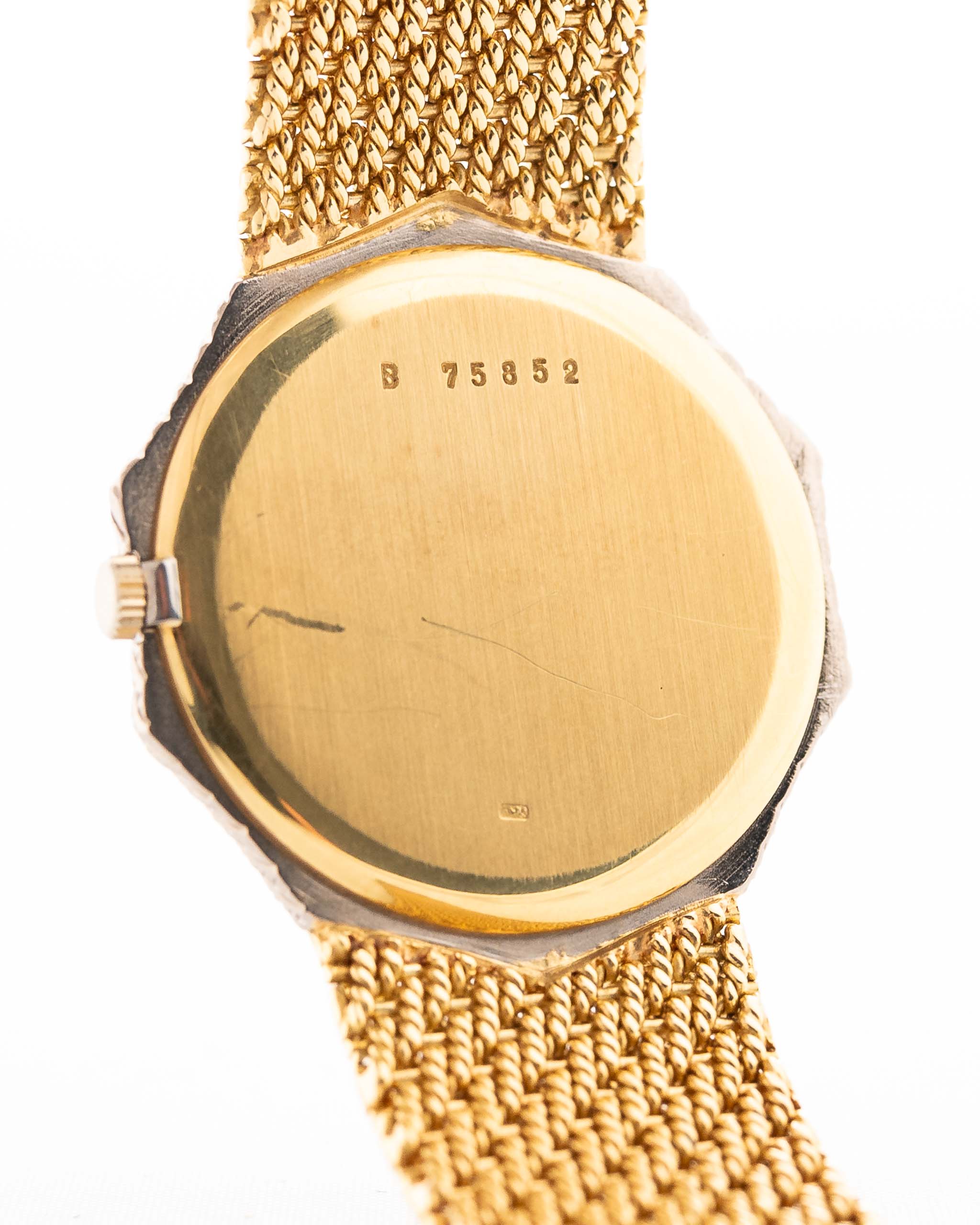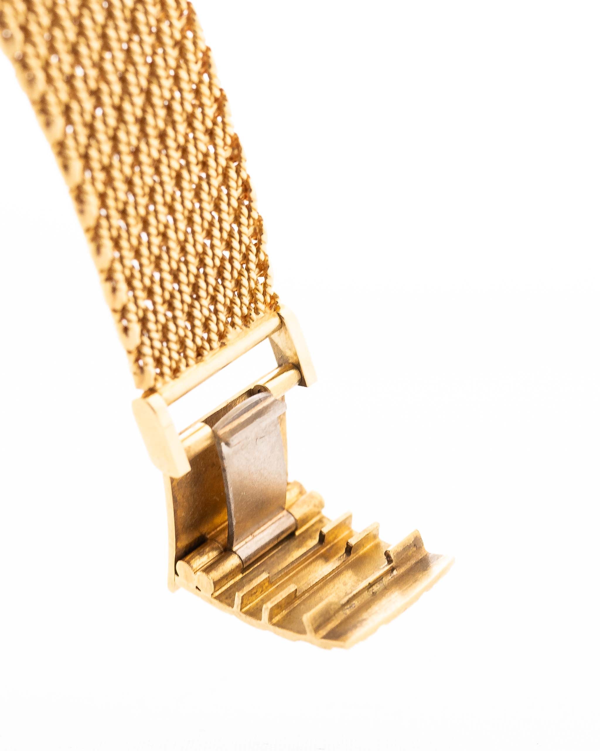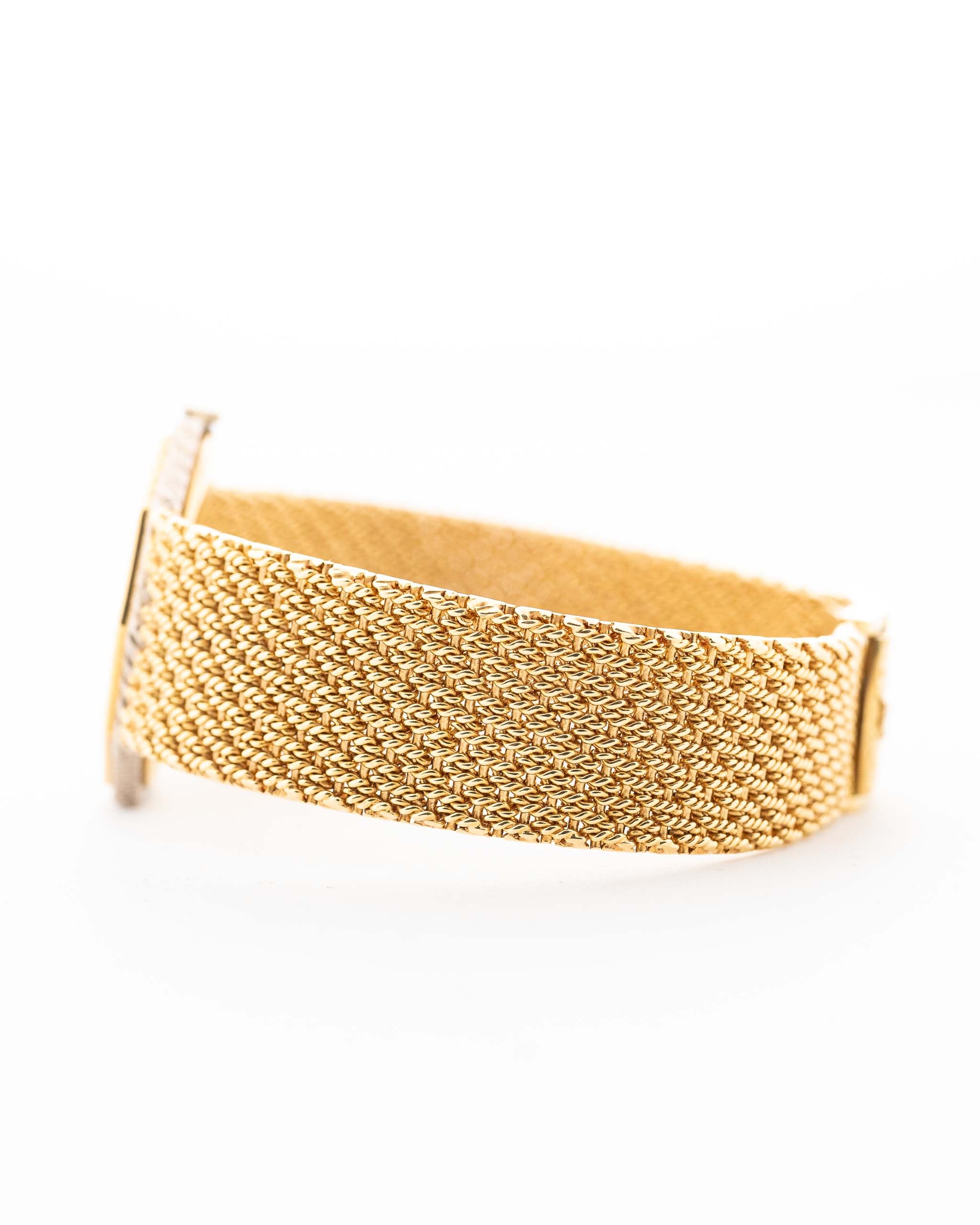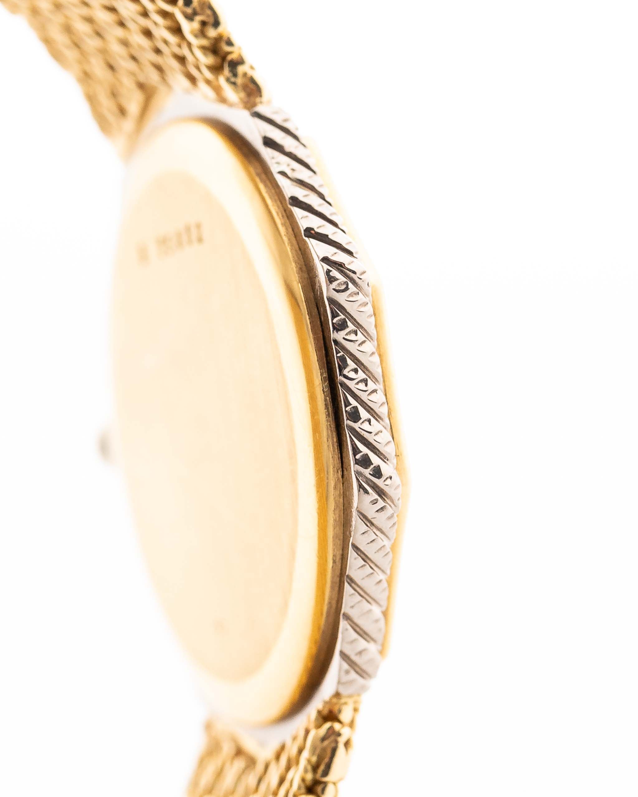 An octagon shaped 18k yellow gold case golden aventurine dial with AP logo. Golden roman twelve, three, six, nine dial layout and alpha handset. The icing on the cake is the white gold bezel in rope design and very unique 18k yellow gold bracelet with AP logo at the clasp.