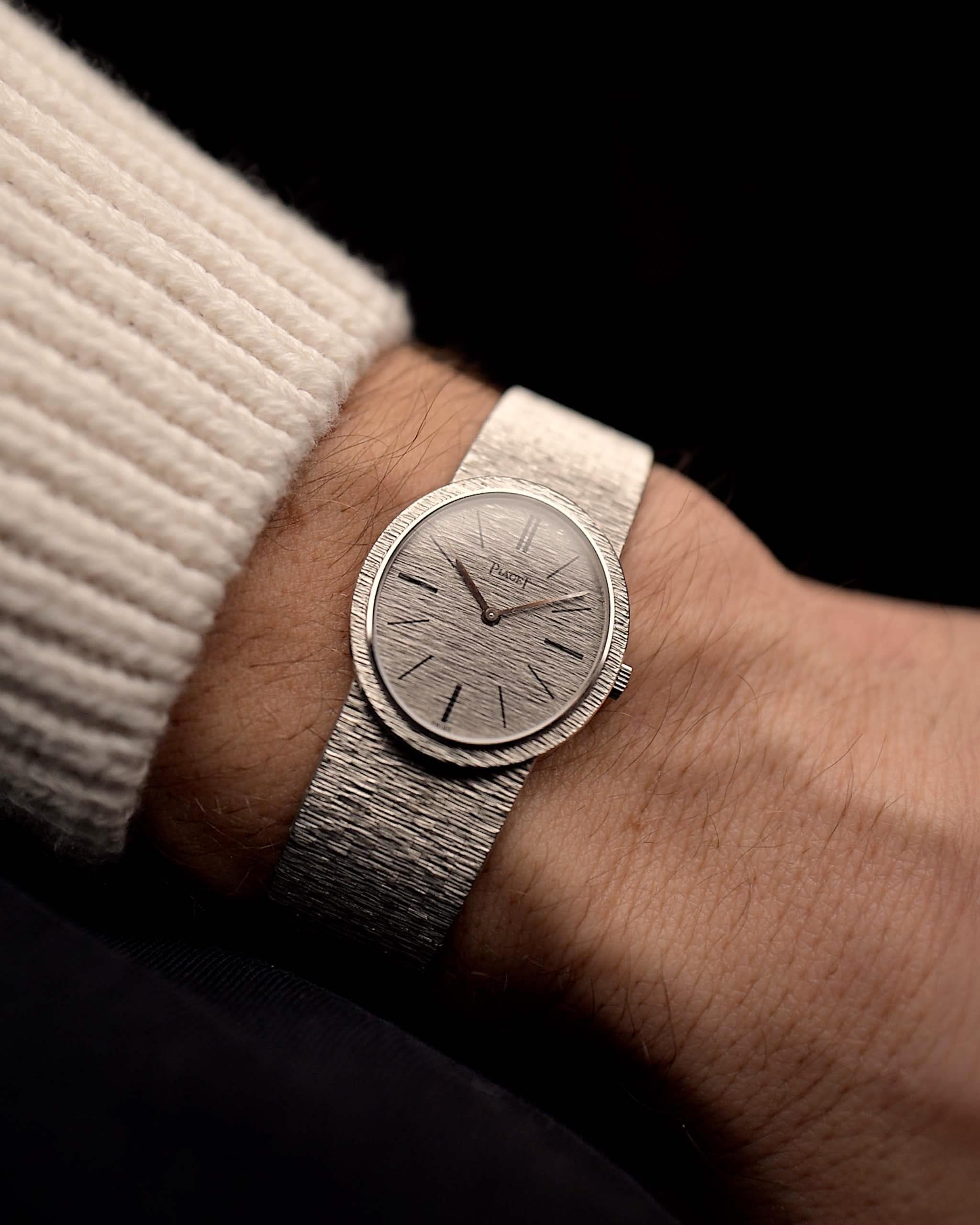 Our piece comes in fantastic condition with a stunning integrated 18k white gold Piaget bracelet, the 18k white gold dial with stick hands and hour markers in flawless condition. The overall appearance with the ellipse case shape with the no lug design is a piece of art.
