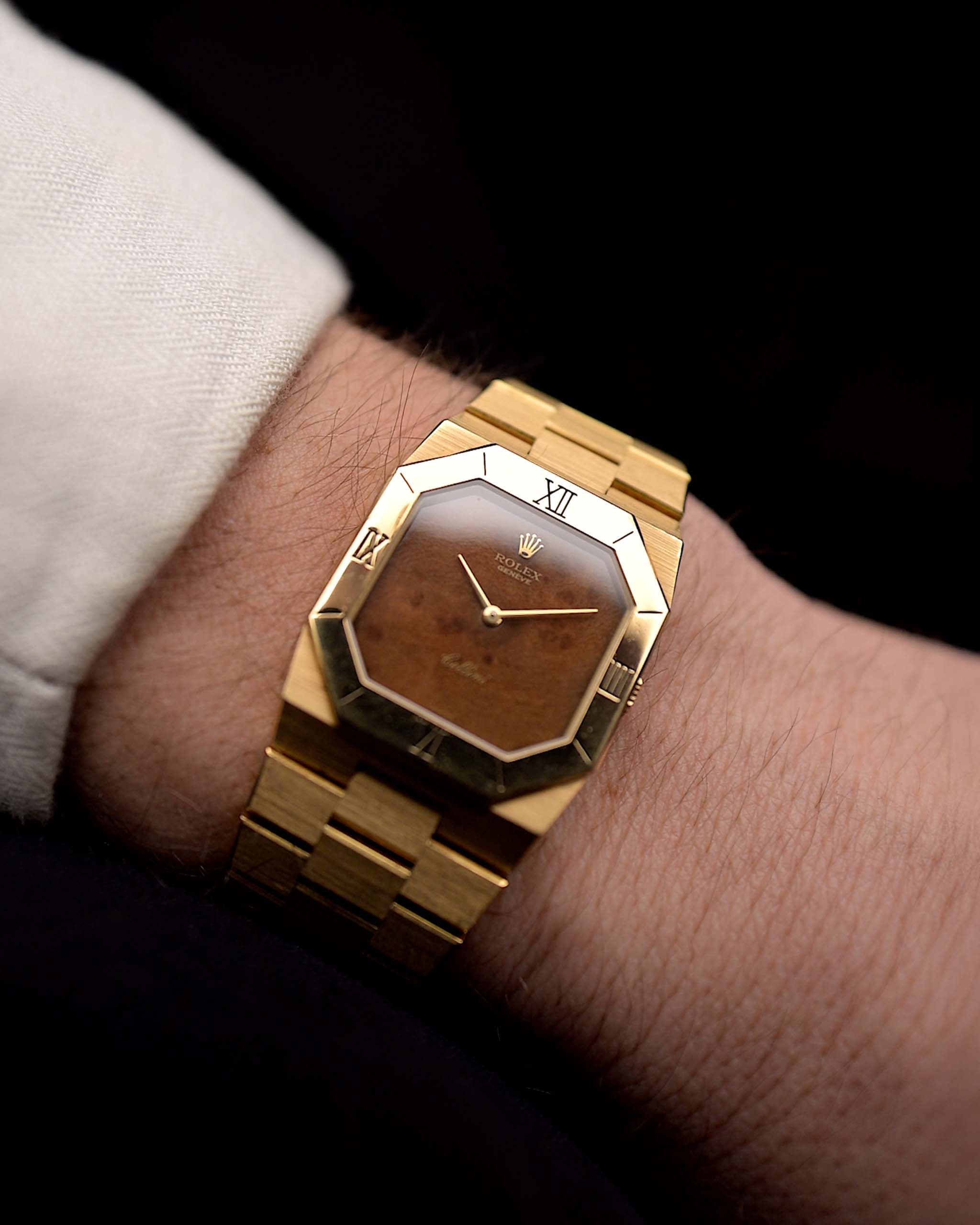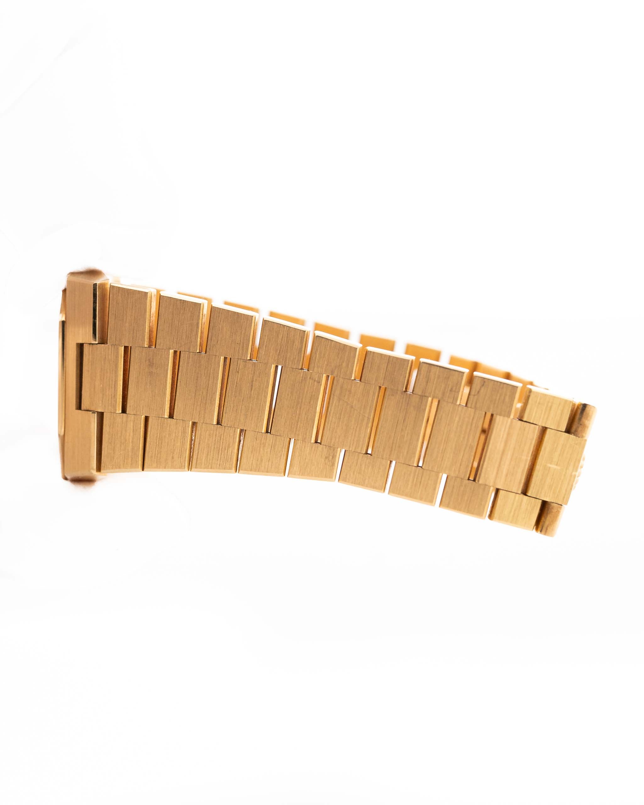 The Rolex Cellini line showcases the dressier side of Rolex compared to its more well-known sport models. Our Ref. 4350 is fitted in a 18k-yellow-gold square-shaped case, which is an unusual case shape for Rolex and a perfectly fitting 18k President bracelet with 18k folding clasp without any stretch and in fabulous condition.